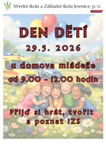Přijďte s námi oslavit den plný radosti, pohybu a smíchu a to 29.5.2026 od 9:00 – 12:00 hod u domova mládeže v Jesenicích. Čeká vás dopoledne plné her, soutěží a překvapení pro všechny děti.