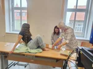 Ve dnech 14. listopadu 2025 a 11. prosince 2025 proběhl v prostorách SŠ a ZŠ Jesenice, p. o. odborný kurz zaměřený na kompresivní terapii a techniky bandážování. Akce byla připravena pro žáky 3. ročníků oboru Ošetřovatel a stala se významným doplněním jejich odborné přípravy. Odborným garantem kurzu byla Mgr. Němečková ze společností Lohmann & Rauscher, jedním z předních světových výrobců zdravotnického materiálu. Díky jejich podpoře měli žáci možnost pracovat s moderními kompresivními pomůckami a vyzkoušet si aktuální postupy používané v klinické praxi. Lektorka žákům představila nejen teoretické základy kompresivní terapie, ale především širokou škálu praktických dovedností. Účastníci si osvojili různé typy bandáží, správnou techniku aplikace kompresivních návleků i zásady péče o pacienty se žilní či lymfatickou insuficiencí. Důraz byl kladen na praktickou činnost, samostatnou práci a adekvátní ošetřovatelský přístup. Atmosféra obou kurzů byla velmi aktivní a přátelská. Žáci prokázali velký zájem, zvídavost i zručnost, což ocenili jak organizátoři, tak lektoři. Na závěr obdrželi všichni účastníci potvrzení do svého profesního portfolia, které dokládá jejich aktivní účast a získané znalosti. Kurz tak výrazně přispěl k posílení jejich odborné kvalifikace i sebevědomí v oblasti přímé ošetřovatelské péče. SŠ a ZŠ Jesenice plánuje na podobné odborné aktivity navázat i v budoucnu, aby studentům poskytovala co nejširší možnosti profesního růstu a kvalitní přípravy na praxi.